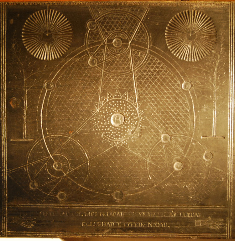 Yn y llechi ar ymyl disg yr haul mae dau fanylyn esboniadol. Dau ddisg cerfiedig. Ym môn llafn y diffyg ar y lleuad (chwith) mae dwy lygad, trwyn a cheg – wyneb. Ym môn llafn y diffyg ar yr haul (dde) mae’r disg wedi’i gerfio â llinell ar gefndir o ysgythriadau llorweddol. Ai delwedd drosiadol o lygad (yr haul) ar gau yw’r bwriad ? (Diddorol fyddai gwybod tarddiad y ddelweddau hyn.)