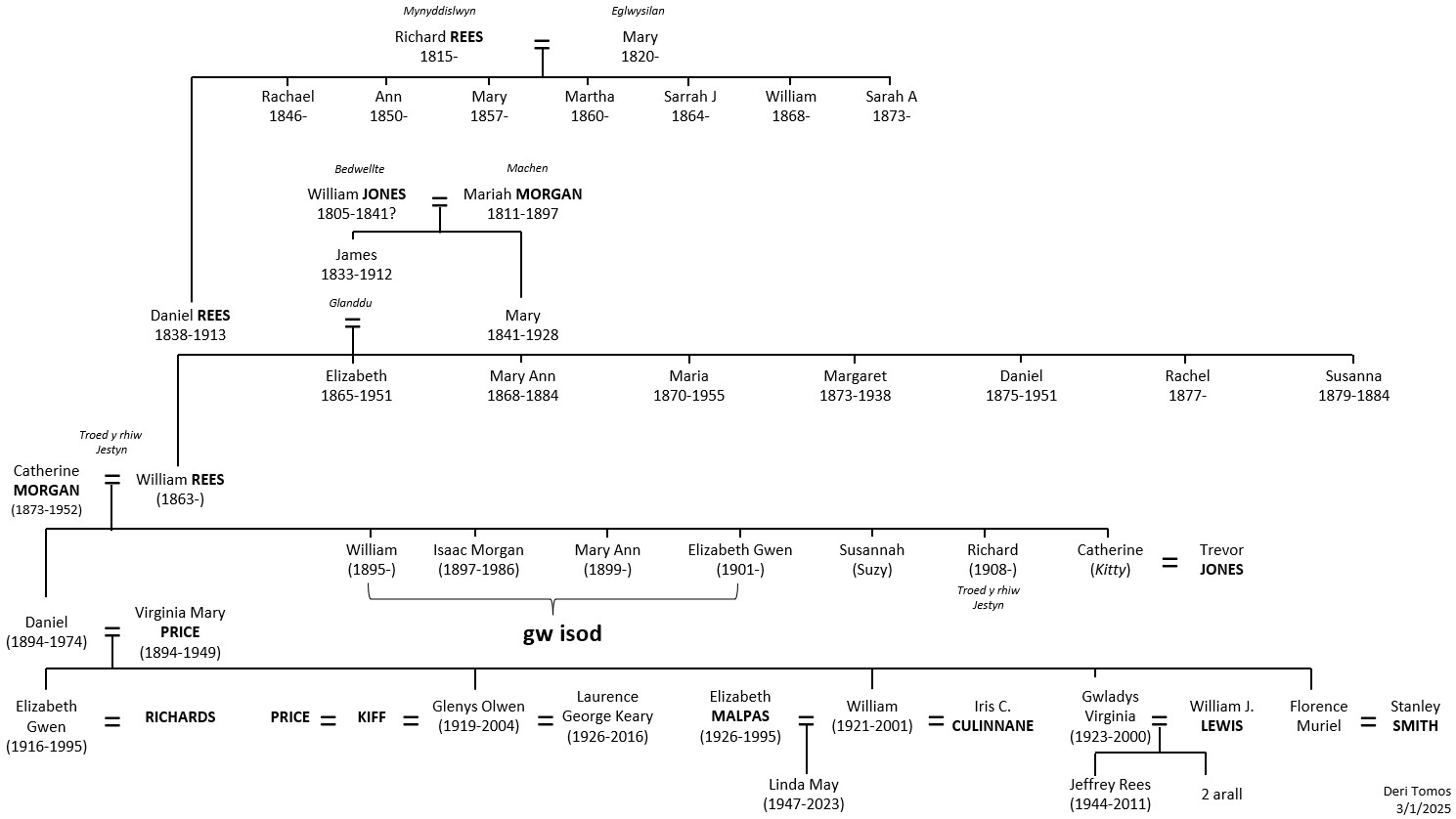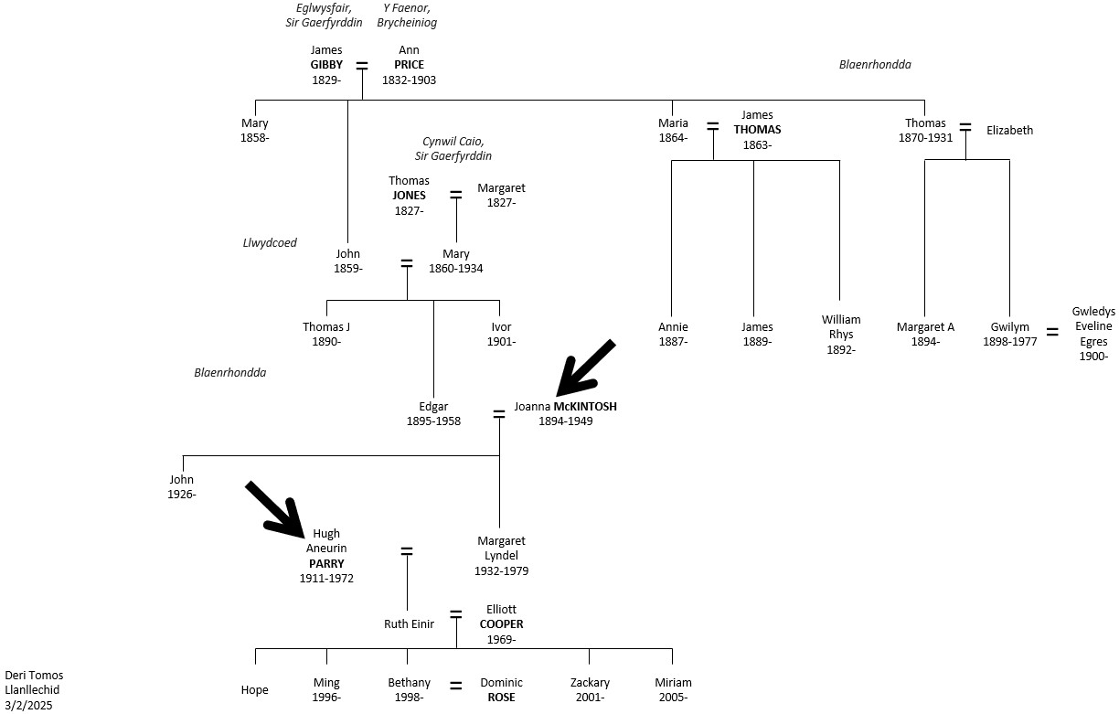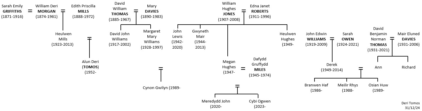 | William (Deri) (1874-1961) | Sarah Emily Griffiths (1871-1916) Edith Priscilla Mills (1888-1972) | Llangurig Defynnog Trecynon | rhagor |